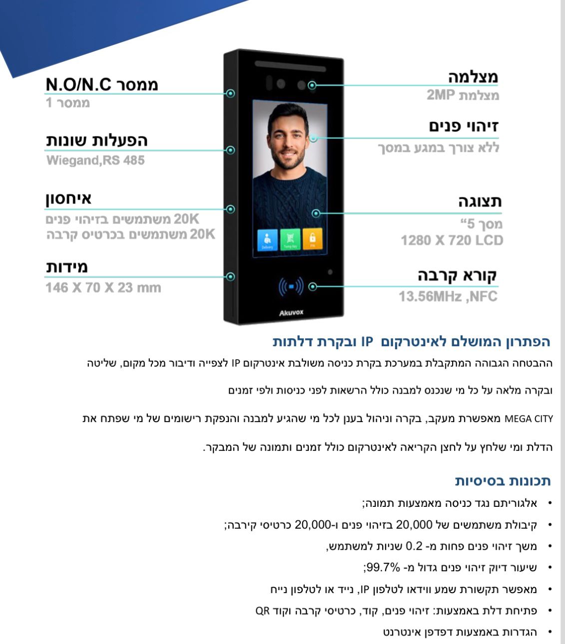 המערכות כוללות זיהוי פנים לפתיחת דלתות ושערים באופן אוטומטי, שליטה דרך אפליקציה, וידאו באיכות גבוהה ושילוב מלא עם מערכות אבטחה ובית חכם.